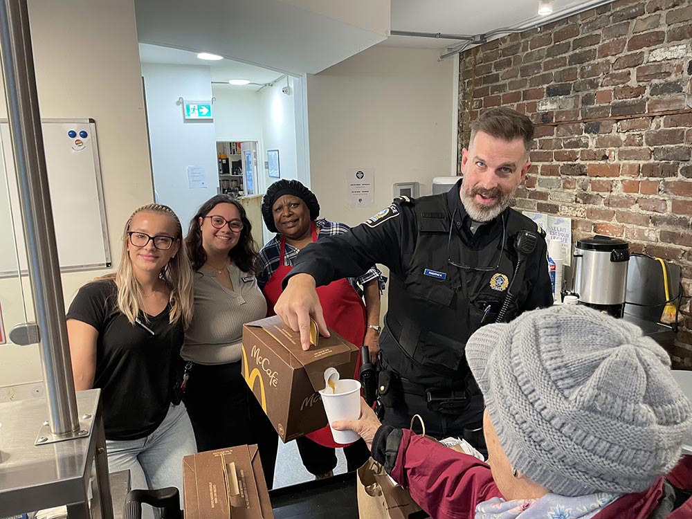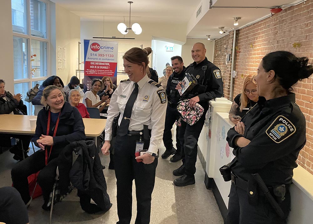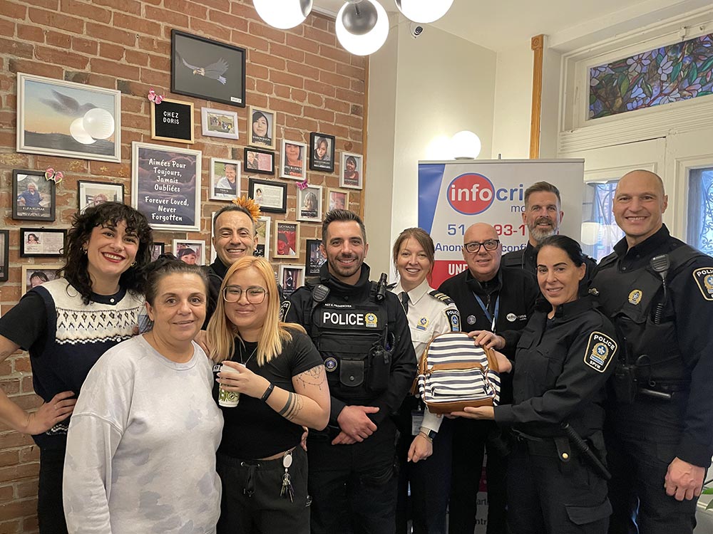 À l’occasion des fêtes les agents avaient eu l’idée d’utiliser un contenant original, soit un petit sac à dos très design provenant des boutiques Ardène qui viendrait mettre un peu de joie pour les bénéficiaires. Le jour de l’événement les bénéficiaires et bénévoles de Chez Doris ont eu droit en plus à du café servi par les policiers du PDQ 12. La démarche a été couronnée de succès et la soixantaine de femmes présentes ont été touchées par l’initiative du SPVM et d’Info-Crime Montréal.